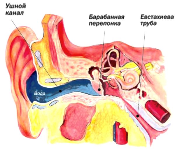 - случайного попадания воды во внутренний раздел уха (при купании в бассейне, море или ванной);