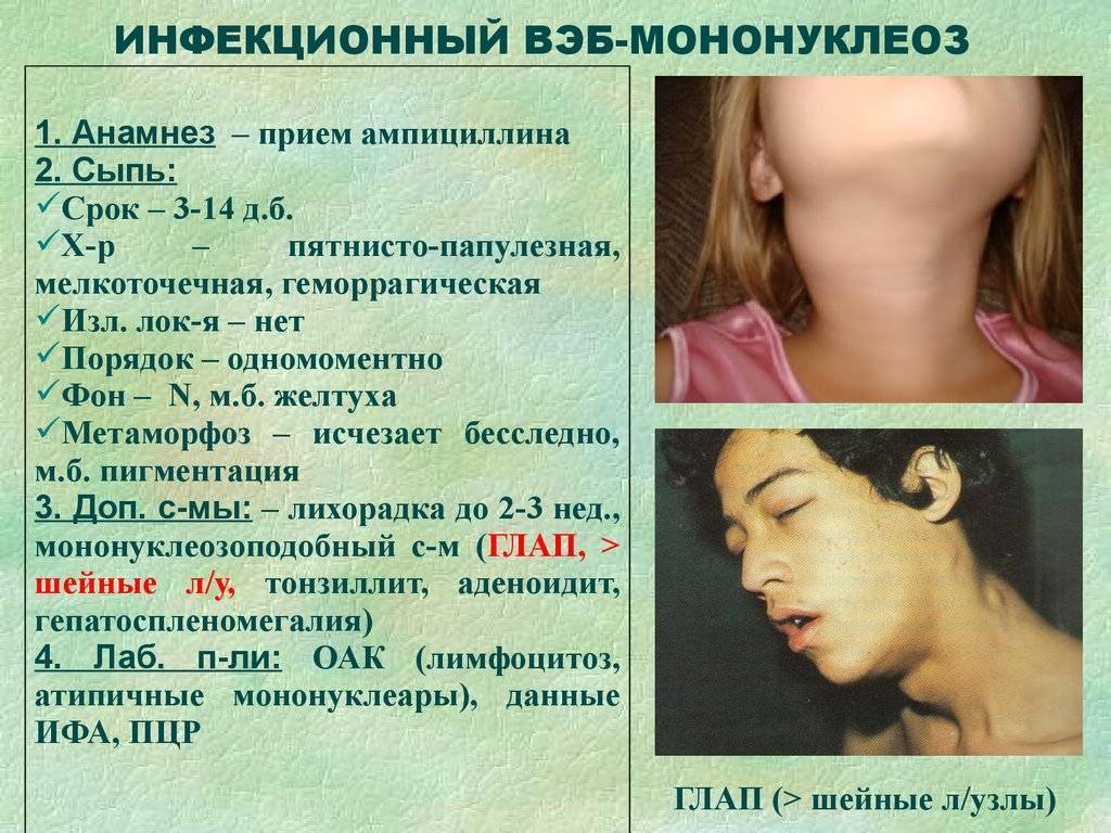 - тонзиллит при ВЭБ часто сопровождается активным размножением стафило и стрептококков, что является причиной ошибочного выставления диагноза «ангина» и назначением антибиотиков амоксициллинового ряда;