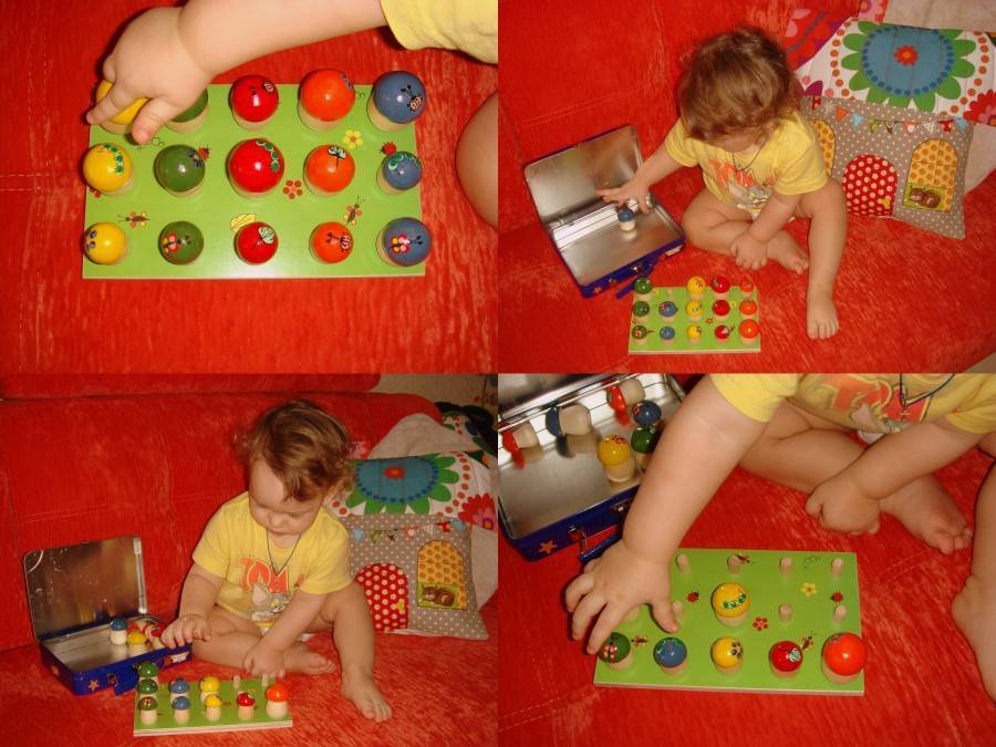 - Наблюдательный карапуз внимательно будет следить за любым занятием взрослого. Построение пирамиды из кубиков, игра в колечко, перекладывание посуды, раскладывание карточек – все эти действия вдвоем с взрослым являются шагом в новый мир. Пусть малыш с удовольствием развалит башню или оденет колечко на палочку. Нужно вместе с ребенком собрать детали в коробку. Потом он сможет выполнить это сам.