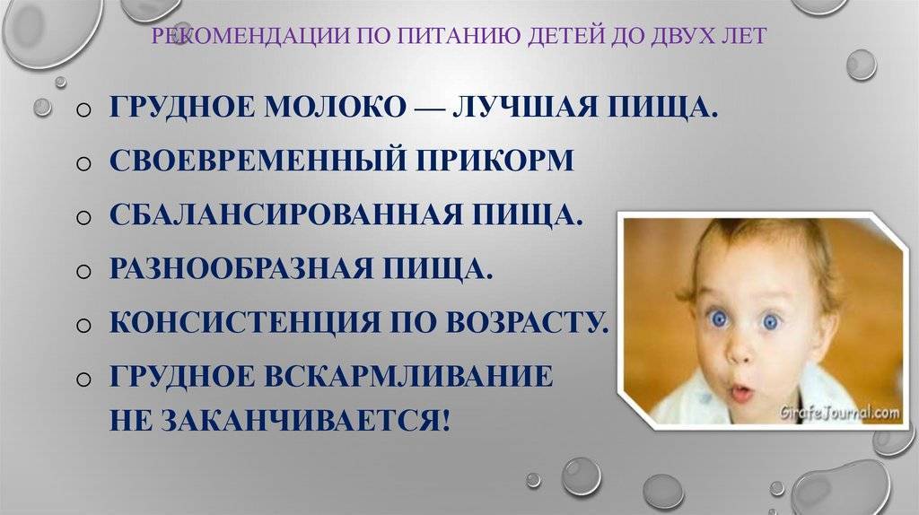 С шести месяцев, ребенка рекомендуется начинать кормить кашами и пюре, постепенно замещая ими грудное кормление так, чтобы к 1 году малыш мог полностью отказаться от грудного вскармливания. Общий принцип таков: в первый день скармливают одну ложечку, во второй — две и так далее до порции, способной заменить одно кормление. Кормить надо в первой половине дня. Если на каком-либо из этапов у ребенка появляется аллергическая реакция на определенный вид прикорма, то прикорм заменяют на другой и начинают сначала, с одной ложки. Когда одно кормление удается заменить, приступают к кормлению новым видом прикорма в другое время дня, снова с одной ложечки, не отменяя кормления предыдущим.