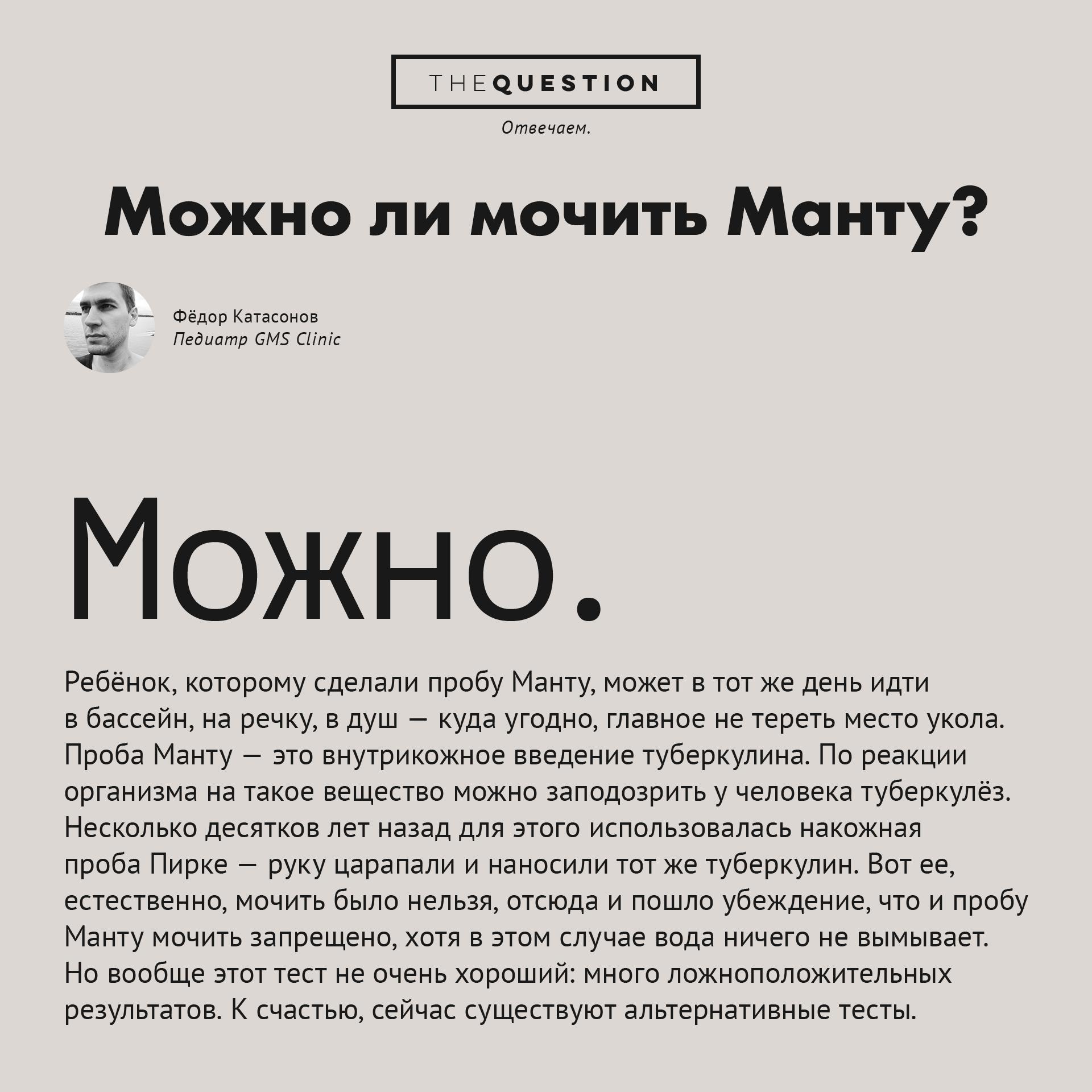 С описываемой пробой связано немалое количество мифов. Среди детей (да и среди их родителей) ходит такой слух, что, если ребенок намочил себе Манту, то он может заболеть туберкулёзом. Поэтому вопросы, можно мыться с Манту или нет, возникают довольно часто.