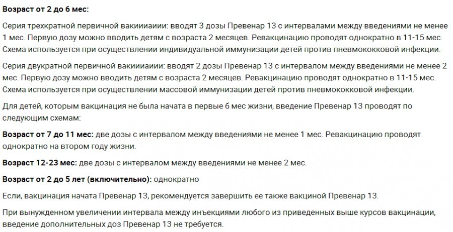 Профилактика осуществляется в возрасте от двух месяцев жизни до пяти лет включительно. При постановке прививки Превенар инструкция является обязательной к изучению как родителями, так и медработником.